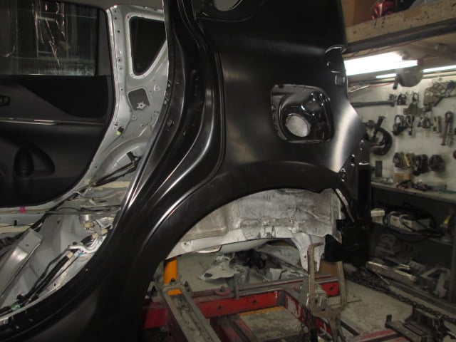 当該車両は左後部に後方よりの強い衝撃を受け、リアバンパーからバックドア並び左クォーターパネルに大きなダメージを受け、リアサイドメンバーおよびフロアパネルに大きく波及していました。