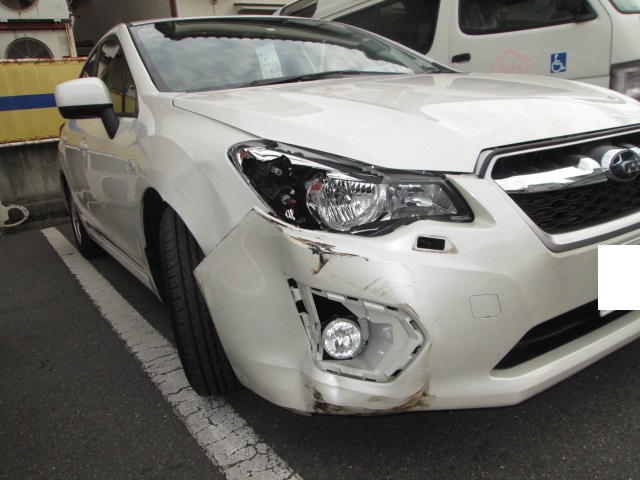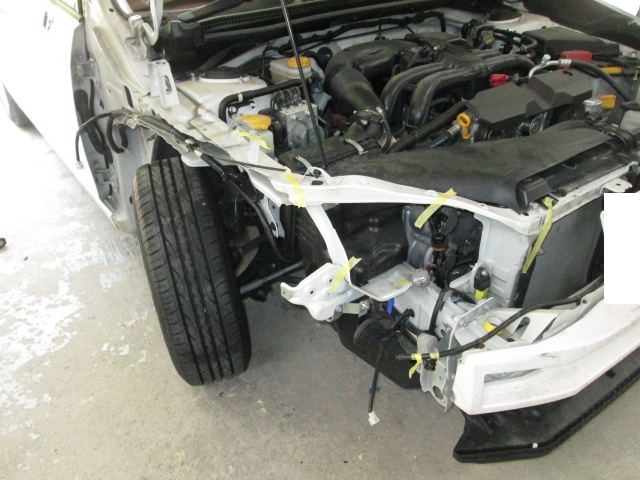 スバル インプレッサS (カラー№37J) ラジエターパネル鈑金修理・ホイールエプロン鈑金修理・フロントバックビーム鈑金修理・フロントバンパー交換・ヘッドライト交換・フロントフェンダー交換・フォグランプ配線修理  尼崎市のお客様