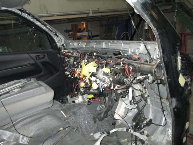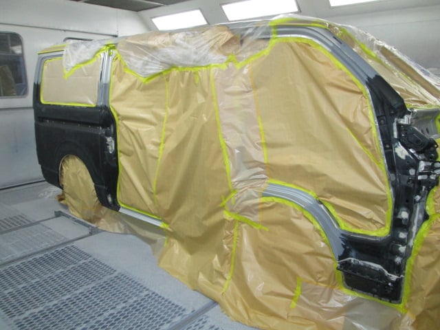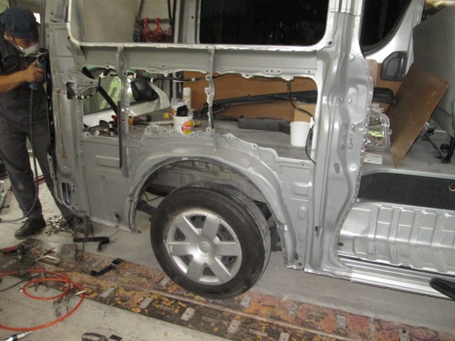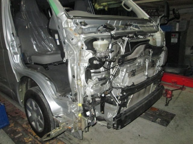 トヨタ ハイエース (カラー№1E7) センターボデーアウタピラー鈑金修理・オープニングサイドフレーム鈑金修理・サイドメンバASSY鈑金修理・クォーターパネル交換・フロントバンパー交換・フォグランプ交換・ヘッドランプユニット交換・フード交換・ドアパネル交換・アウトサイドパネル交換・フロントフェンダー交換  尼崎市のお客様